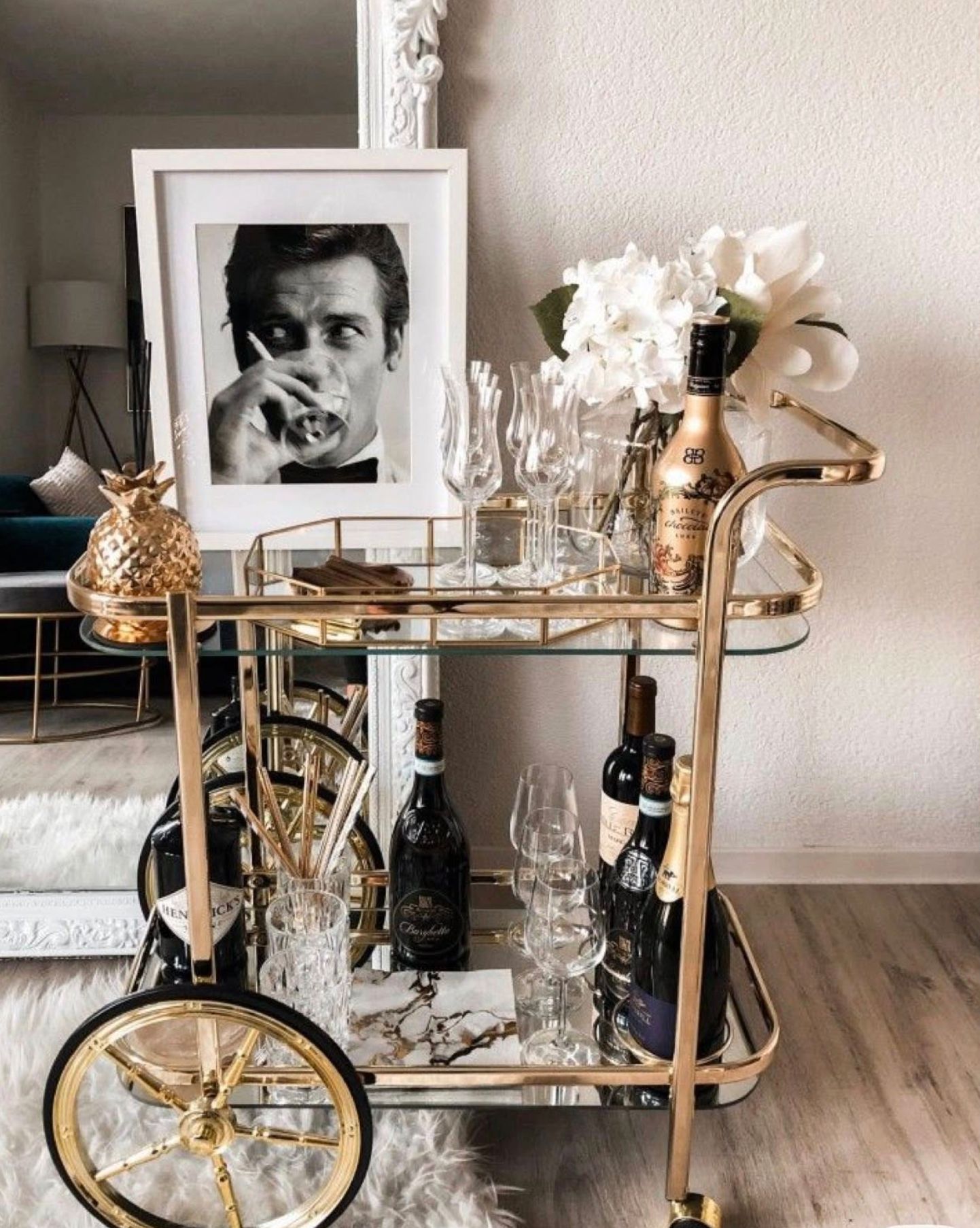 In the office, a bar cart is even more of a power move. It softens hard edges, invites conversation, and elevates the mood from “meeting” to “moment.” It tells clients and colleagues that you’re someone who handles business with taste, perhaps someone who works late into the night, someone who appreciates ritual and who values the slow pour after a fast-paced day. At home, it becomes a stage for your personal aesthetic: the mirrored cart for the modernist, the brass-and-walnut version for the traditionalist, or the minimalist Lucite one for the “Palm Beach-meets-Milan” crowd. Styled properly, it doubles as décor even when untouched.