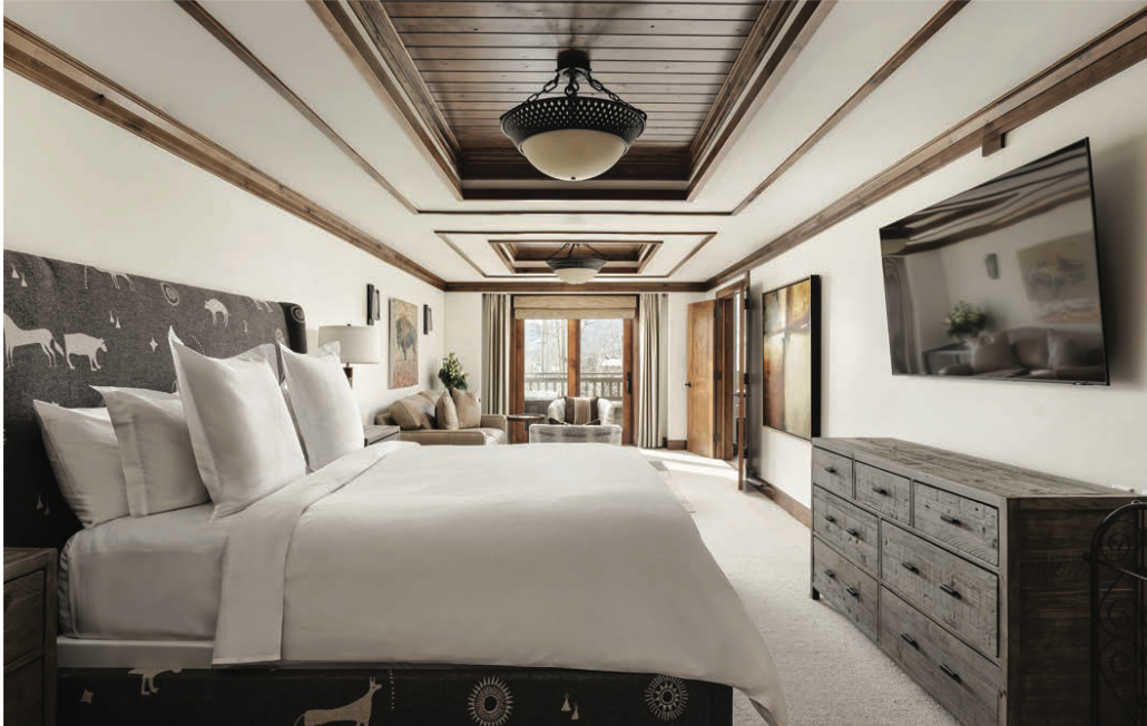Accommodations feel less like hotel rooms and more like private mountain homes. Stone fireplaces anchor the spaces, while deep soaking tubs, plush beds, and private balconies open onto alpine views that silence even seasoned travelers.