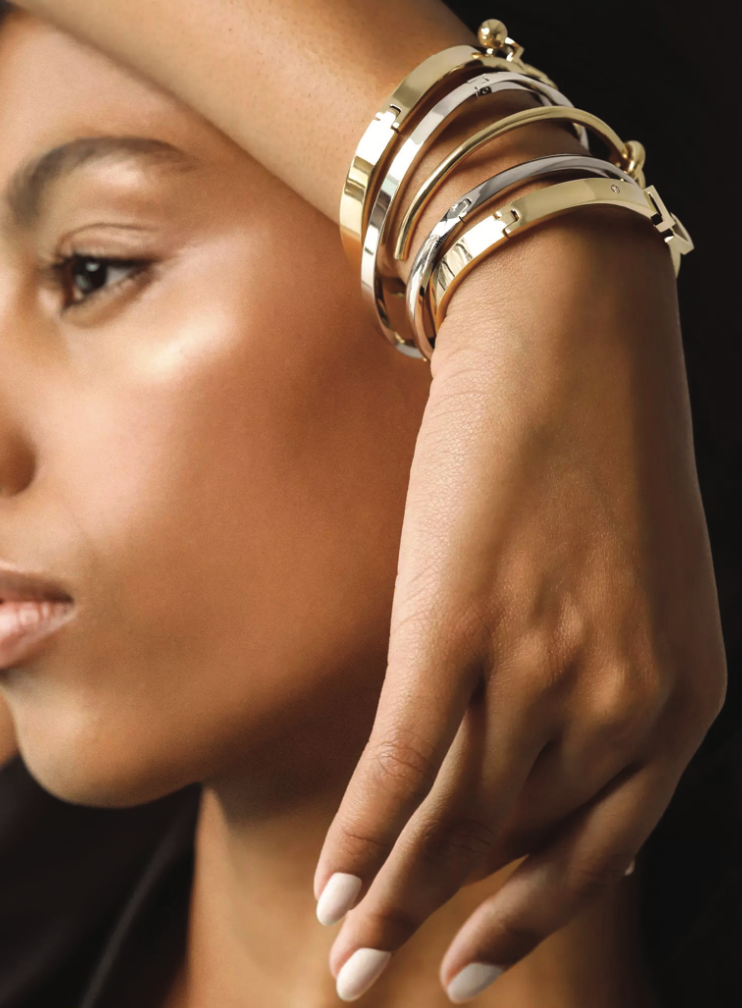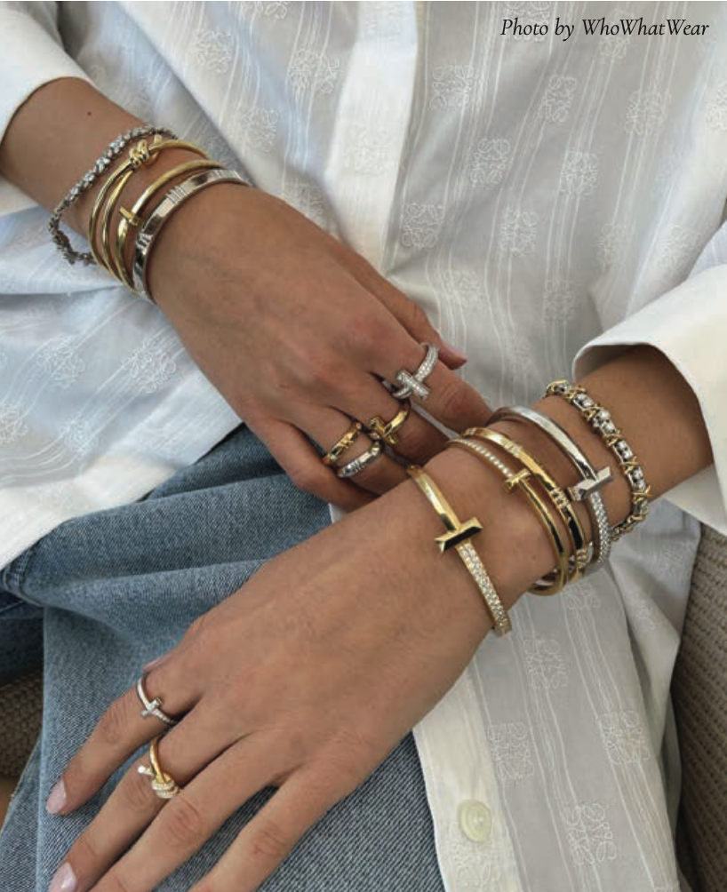 “Wrist stacking continues to be incredibly popular, especially with fine jewelry clients who love mixing meaningful pieces into an everyday layered look. Our Bit of LUV and Huggable Hooves bracelets were designed specially with stacking in mind, they are comfortable, versatile and photograph beautifully when worn together or mixed with other styles.” — Karina Brez