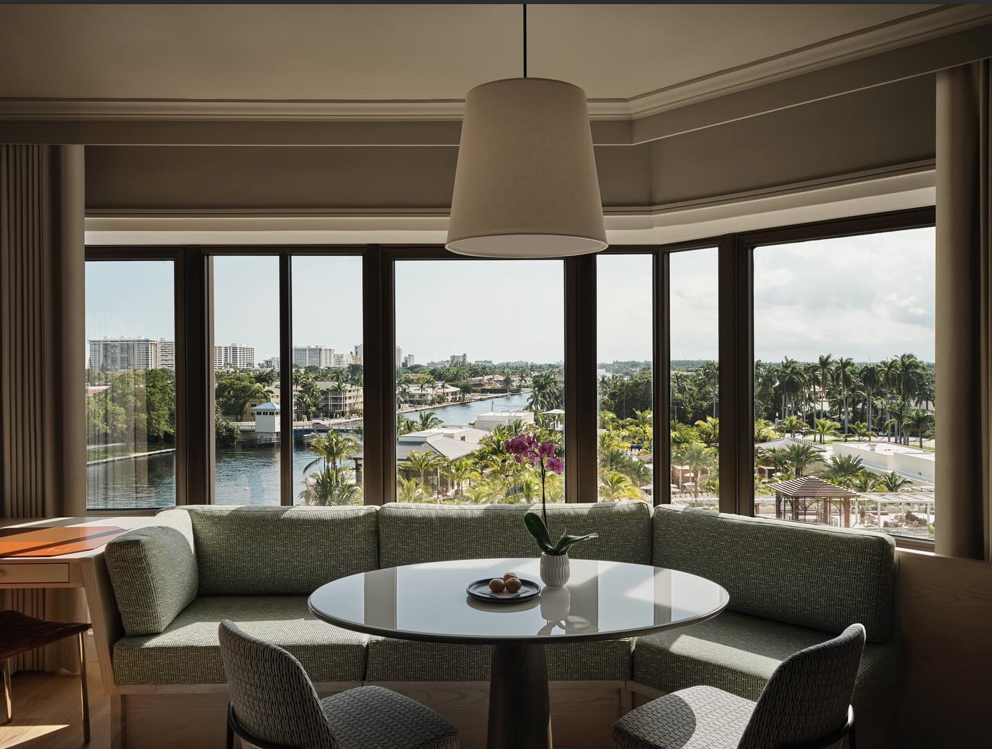 The Tower, where I stayed, is one of five luxury hotels on the property, each catering to a different type of guest. The design by the renowned Rockwell Group blends coastal themes with modern luxury, offering panoramic views of the Atlantic Ocean and South Florida’s coastline. My suite was a perfect haven with custom palm leaf-inspired carpets, warm wood accents, and light flooding in through floor-to-ceiling windows. Other options include The Bungalows which offer apartment-style accommodations with spacious two-bedroom suites, private entrances, and understated, elegant design. For an adults-only retreat, the Yacht Club sits on the lake, featuring all-suite rooms with eye-catching artwork and private butler service. The Cloisters, the most traditionally styled option with dark-wood furnishings and subtle art, is conveniently located near the resort’s main attractions, including dining and shopping.